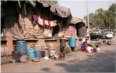 Jeeparna körde genom Mumbais förslummade förorter och höghusbelamrade centrum i nästan nittio minuter innan de kom fram till hotellet. Färden var fysiskt obekväm då vi tvingades sitta inklämda lika tätt som passagerare på Tokyos tunnelbana under rusningstrafik i de för ändamålet på tok för små jeeparna. Den klibbiga värman och avsaknaden av luftkonditionering gjorde inte upplevelsen mer komfortabel. |