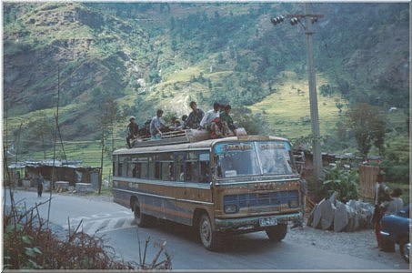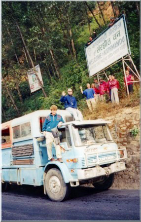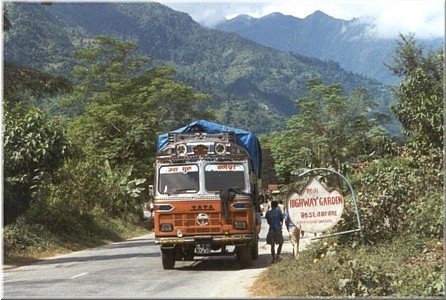 Jules och Clint hade återanslutit sig till expeditionens för sista etappen - också deras mål var, det för oss en gång så avlägsna, Kathmandu. Så alla vi som startade färden i Calais, plus Robin, var med för de sista bergiga kilometrarna. Vädret var fortfarande mulet och allmänt tråkigt; varför vi från flaket inte kunde beundra all den storhet som terrängen lastbilen åkte igenom representerade. Men vi såg i vart fall de lägre delarna av ett landskap som var dramatiskt, ickelinjärt och av den karaktären att människosläktet verkade existera på undantag och lånad tid. Bergen var många, branta och deras nedre regioner gröna och lummiga. Det hela var bedårande vackert. |