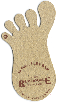 Efter mången hävd sejdel och tömd popcornskål drog vi mangrant vidare till en annan av Kathmandus expeditionsavslutarinstitutioner för att äta vår gemensamma resas sista middag. Restaurangen Rom Doodle’s är alla framgångsrika, i Nepal förlagda, bergsbestigarexpeditioners absoluta klimax. Där firades segrarna som grundlagts genom månader av planering, vandring och klättrande. Ovanför bardisken hängde en stor ljus träskiva varpå alla de som bestigit toppen av Everest, det högsta, hade rätten att skriva sitt namn. Skivan var nästan fulltecknad och de kände alpinisterna från förr var lätta att identifiera: Hillary, Norway, Meissner och Bonnigton. Våra svenska representanter, med Kropp i spetsen, lyckades jag dock inte hitta. Med undantag för